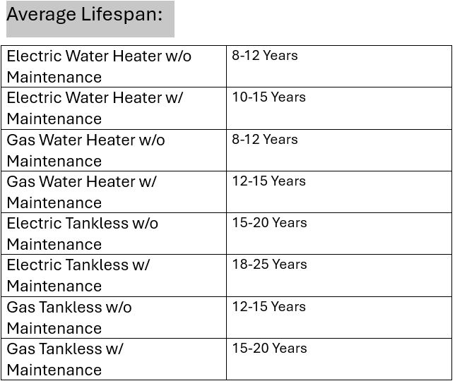 Unit Type- Electric and gas water heaters have slightly differing lifespans. Gas tends to have a shorter life, with a more complex makeup, however are the leaders in efficiency. Electric tends to last a bit longer, with less complexities but not offering the same cost efficiency.